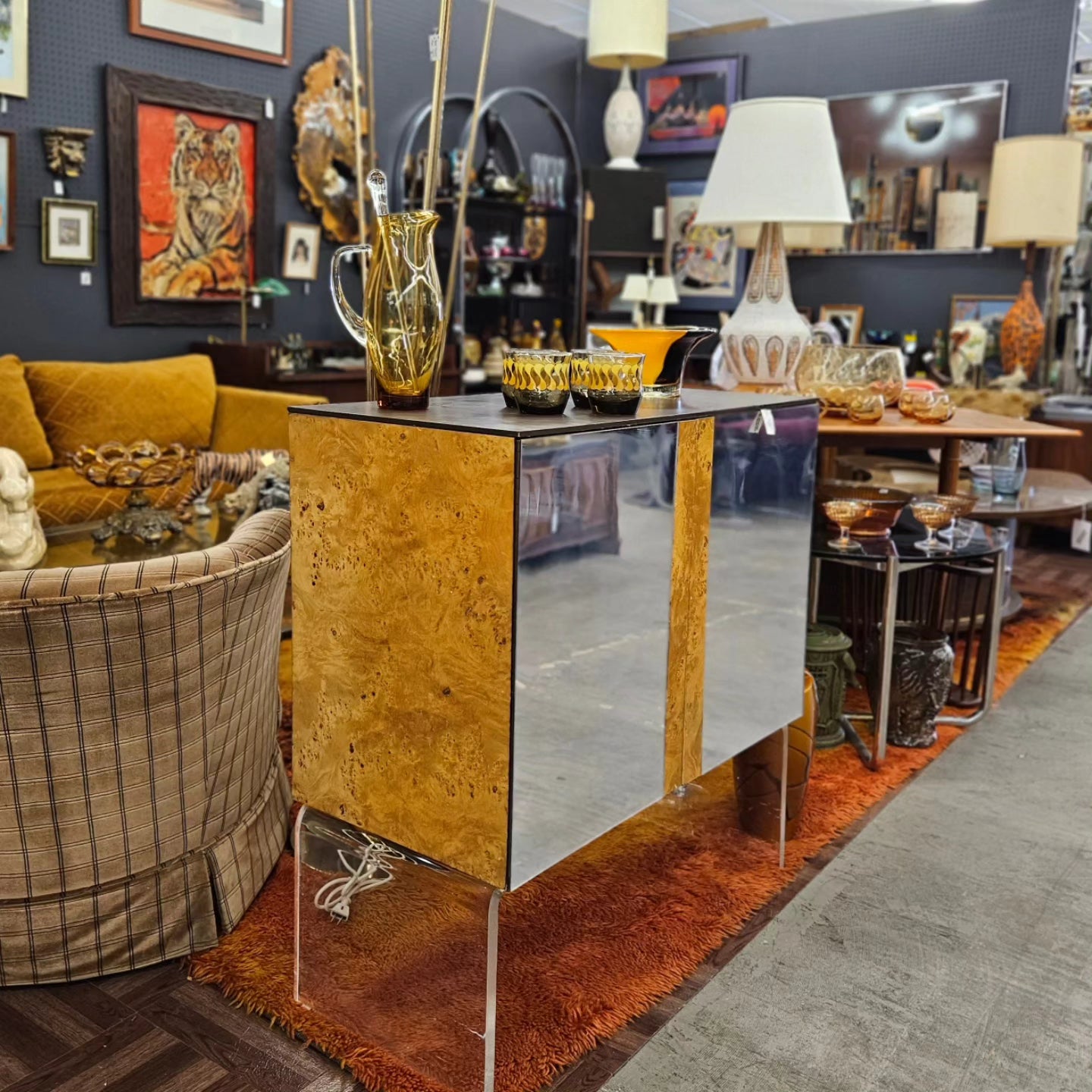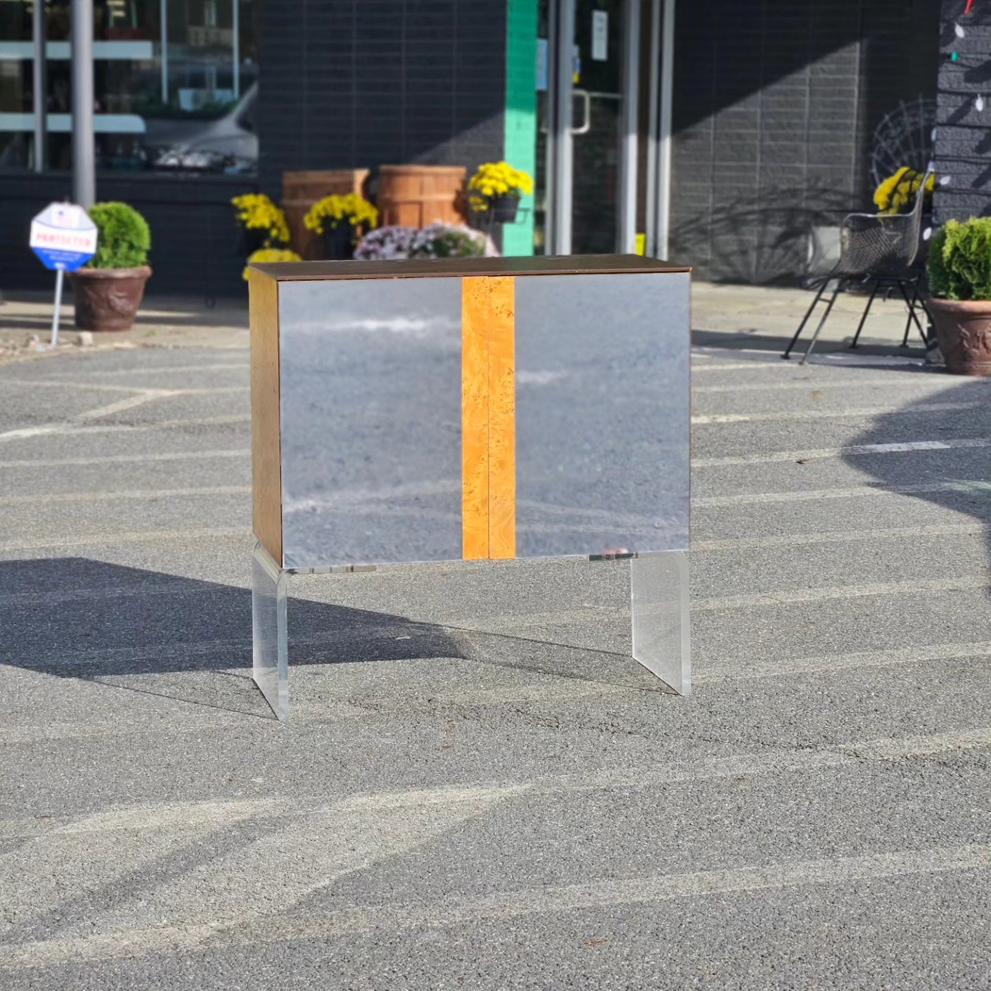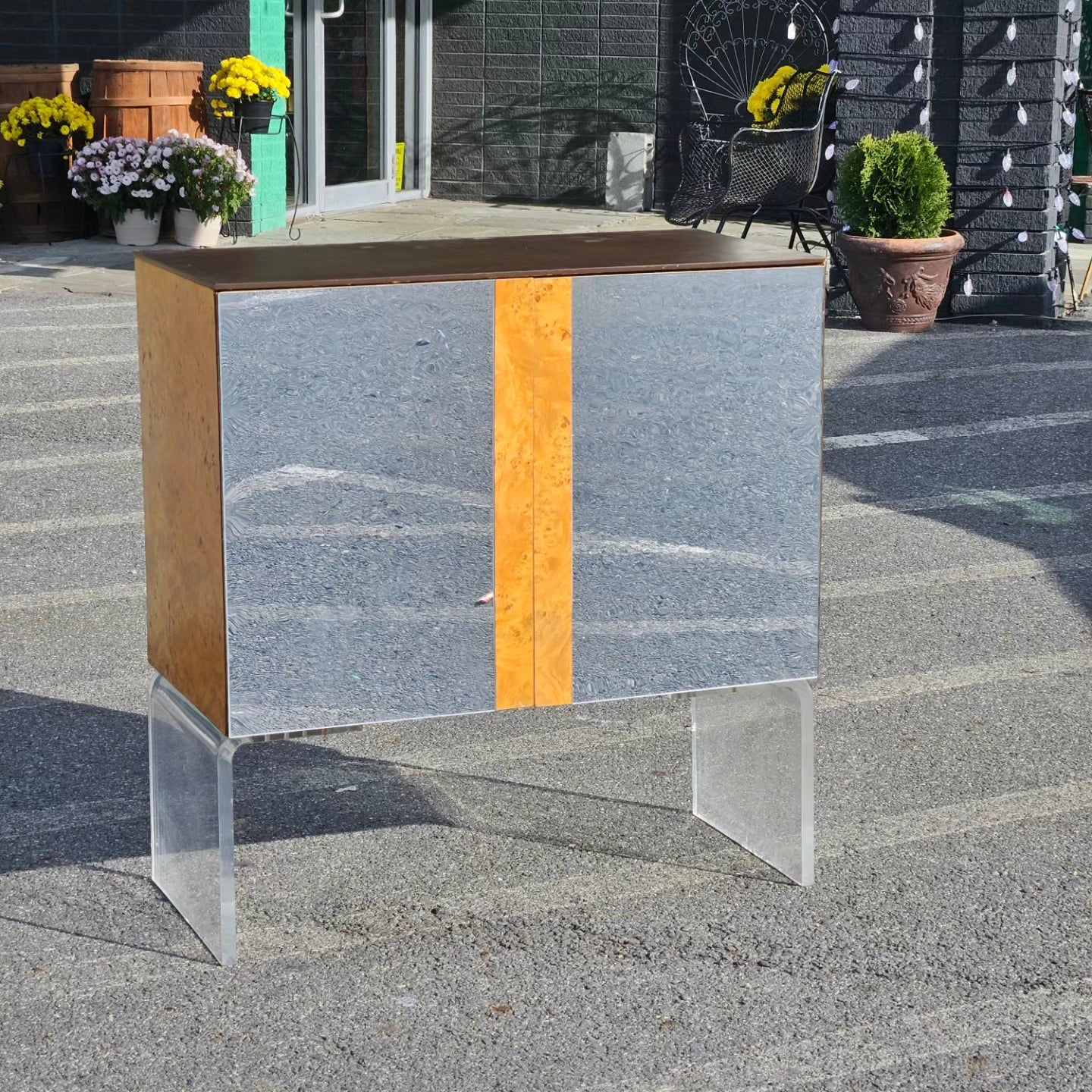 A late 1960's prototype bar cabinet from Hill Manufacturing Co., Newburgh NY. This prototype never made it into production so it's truly one of a kind. Burlwood laminate on bent lucite legs.