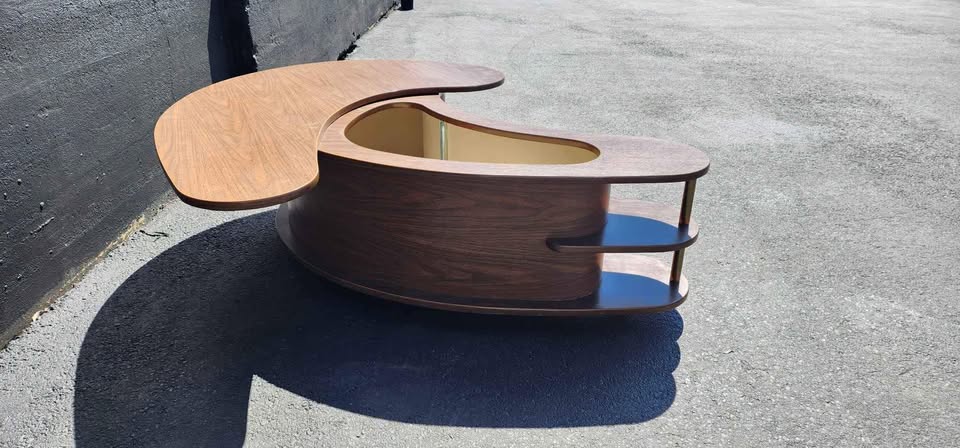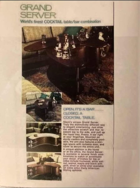 Designed by AH Stock in 1960s and featured in the 1963 World's Fair, the "Grand Server" is a boomerang shaped bar / coffee table. The top swivels open to reveal a floating bar that pull up and locks in place. The side has a locking door to store liquor bottles or barkeep accessories. In pristine condition, roll it right into your living room and have a cocktail!