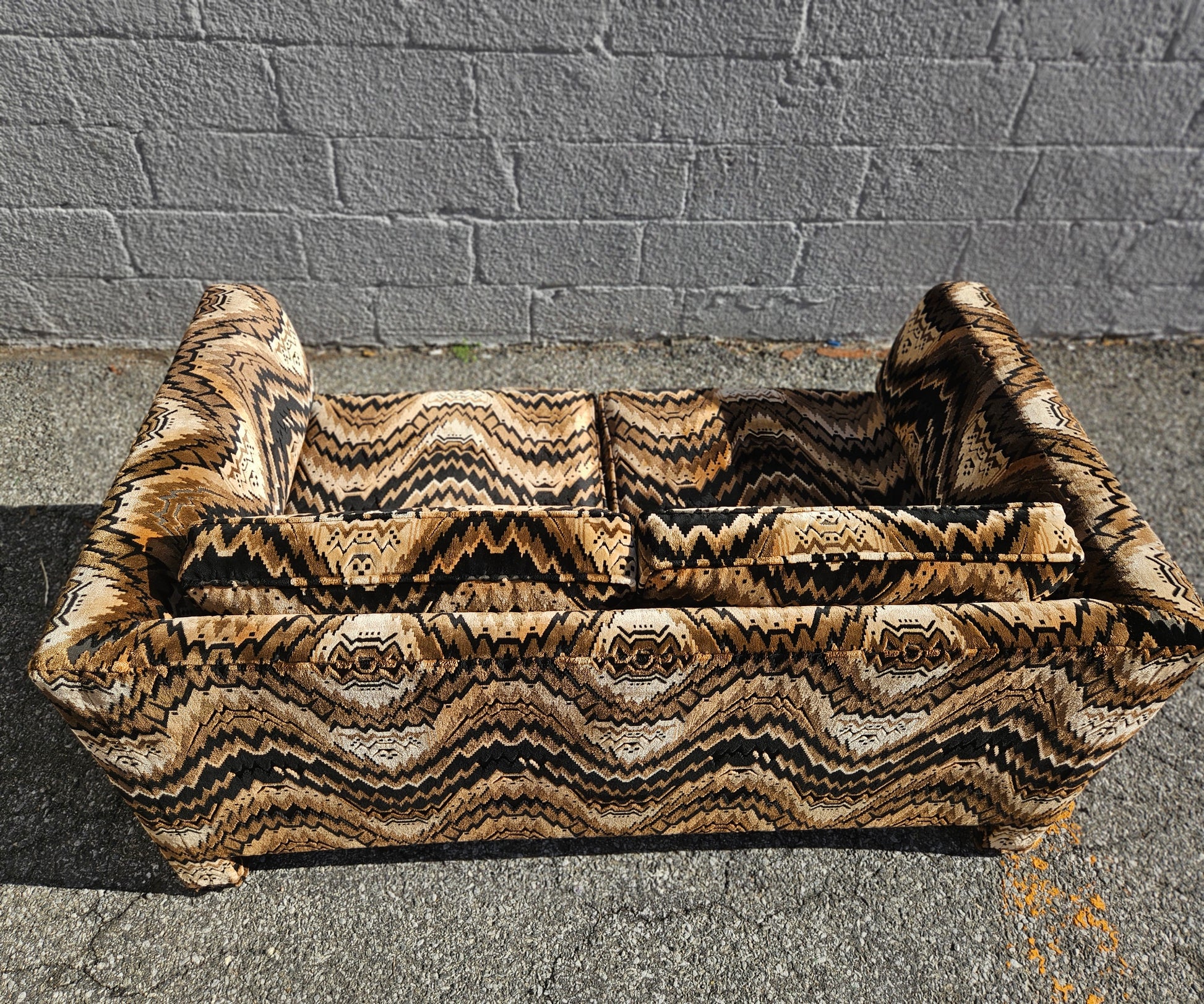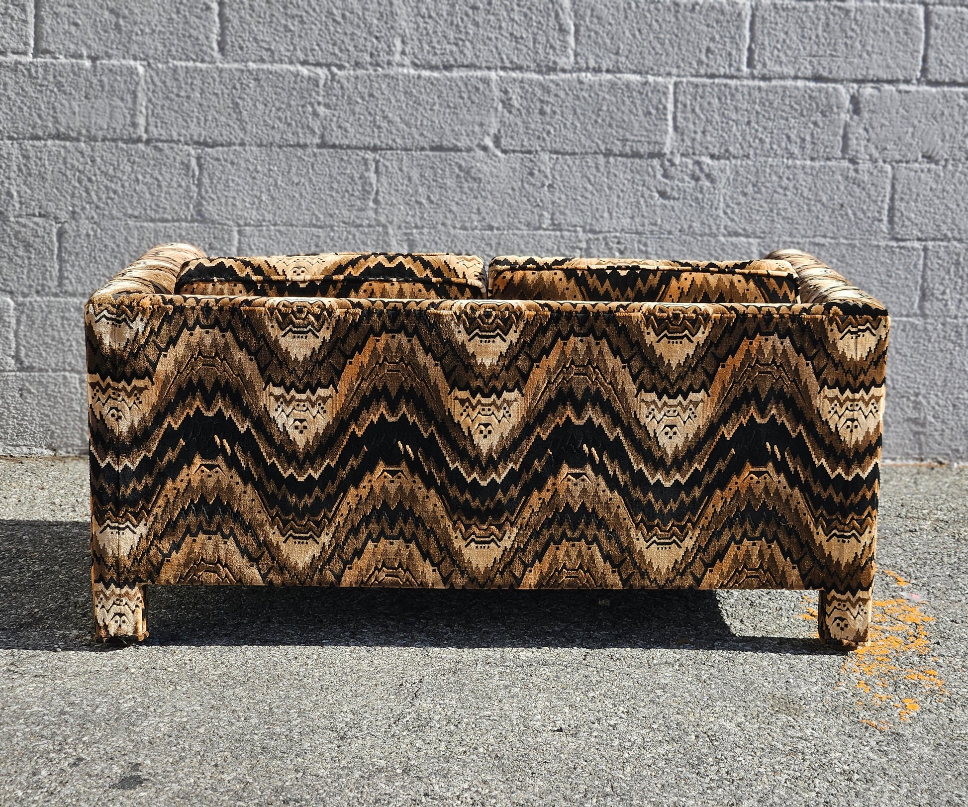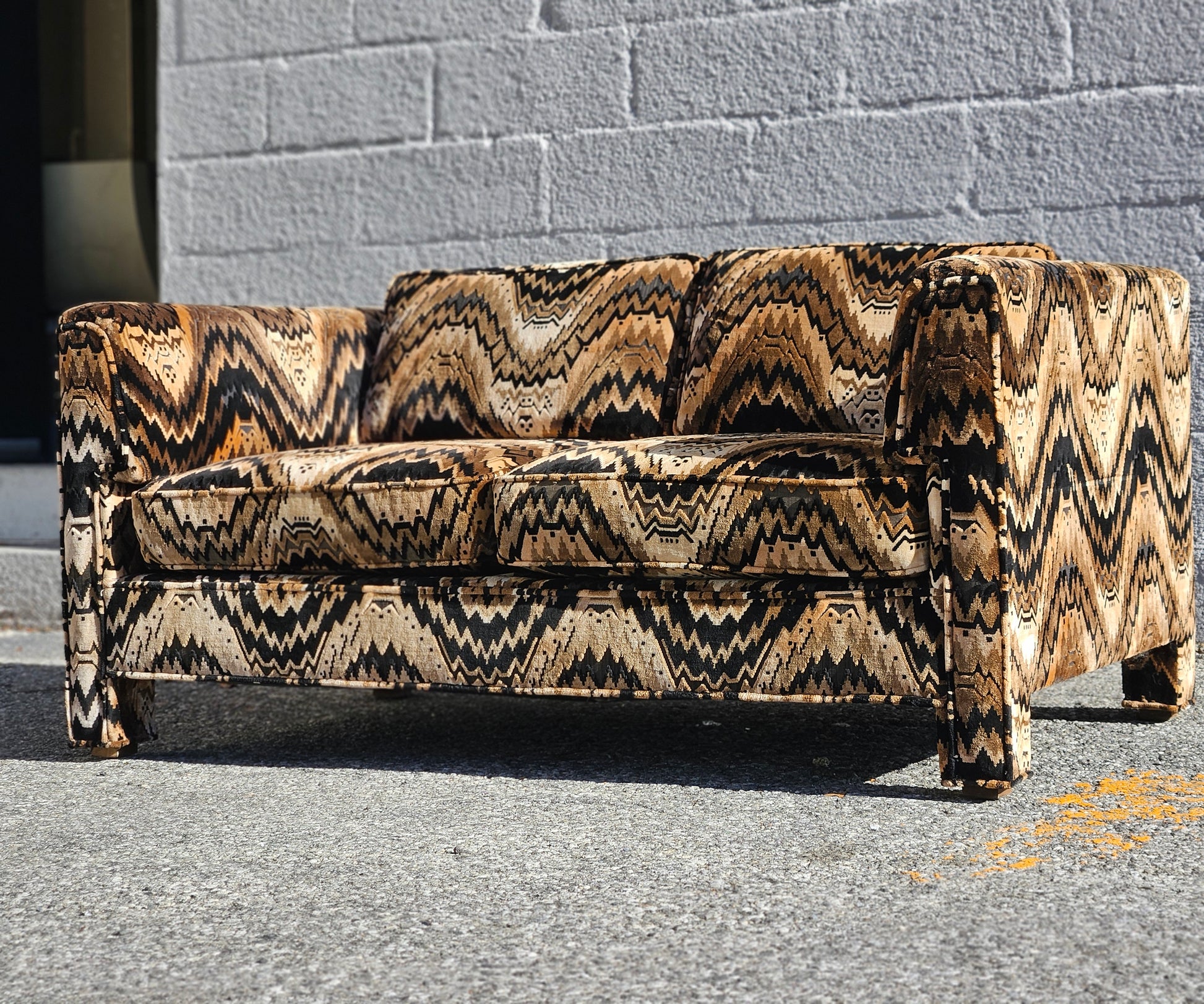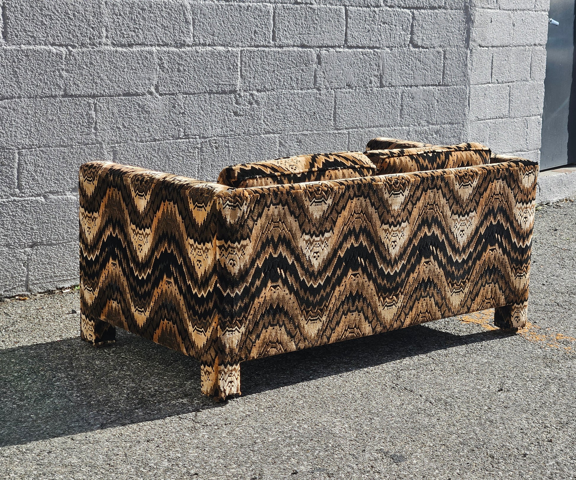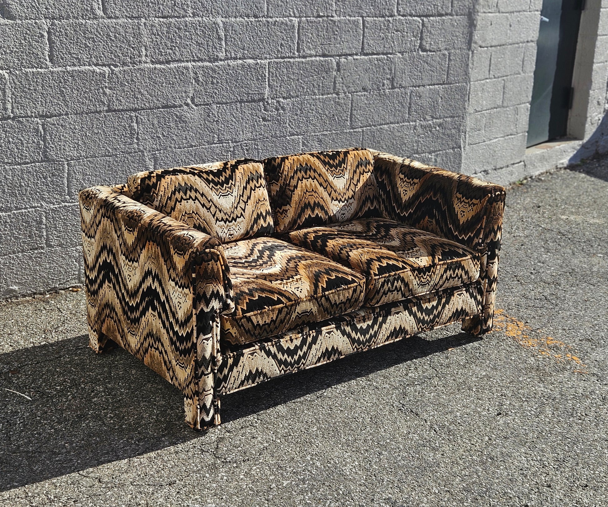 Maker is unknown however, upholstered in Jack Lenor fabric. In immaculate condition.